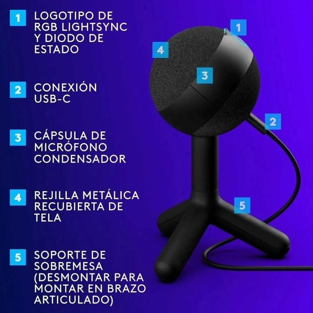 - Contenido de la caja : Micrófono USB Yeti Orb, Soporte de sobremesa extraíble, Cable USB-C a USB-A de 2 m, Documentación del usuario, Código de canje para Streamlabs Ultra